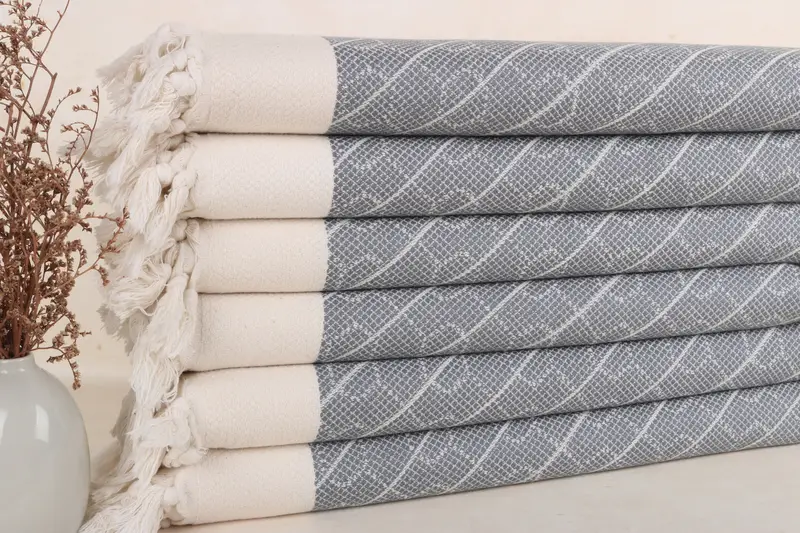 The product is characterized by its 100% organic Turkish cotton composition, ensuring softness and high absorbency. The towels weigh 120 grams and are 36x18 inches (45x90 cm), with a tolerance of up to 2.5 cm due to their hand-woven nature. Each item offers potential for customization through embroidery, allowing for personal details such as names, logos, and dates. Customers should note that the towels must be washed before first use and can be machine washed on a gentle cycle.