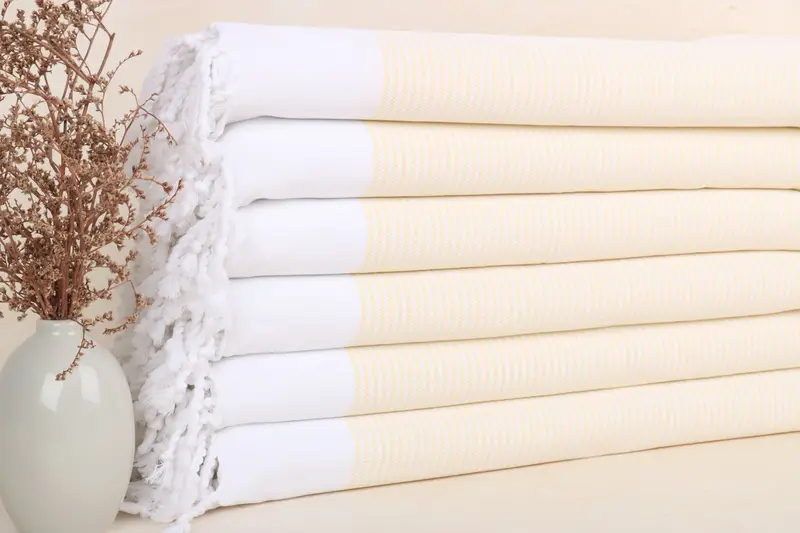 Characterized by 100% organic Turkish cotton, these towels offer exceptional absorbency and softness. Weighing 100 grams, they feature dimensions of 18x40 inches (45x100 cm), with allowable variances of up to 1-2.5 cm due to hand-weaving. Each towel, handwoven on looms in a personal atelier, boasts a subcategory of bath towel with a secondary color of beige.