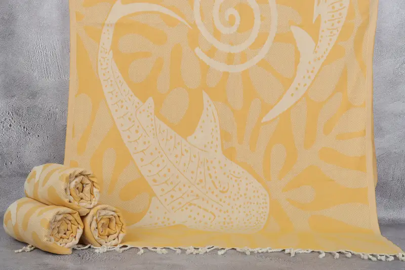 This Turkish beach towel is characterized by its eco-friendly premium Turkish cotton composition, ensuring soft texture and high absorbency. The dimensions measure 40x71 inches or 100x180 centimeters, with a tolerance of up to 2.5cm due to hand-weaving. Weighing 450 grams, it offers a balance of lightweight portability and durability.