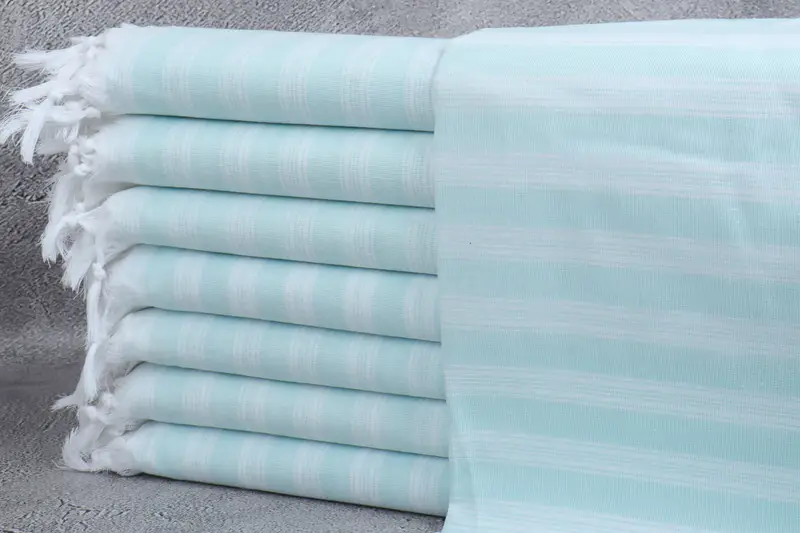 Turkish towels are characterized by a superior fiber composition of ECO FRIENDLY Premium Turkish Cotton, ensuring exceptional absorbency. The towels exhibit a size of 40x71 inches (100x180 cm) with a tolerance of up to 2.5cm, providing an ample dimension for versatile usage. Weighting 210 grams, these hand-woven products combine precision with a slight flexibility.