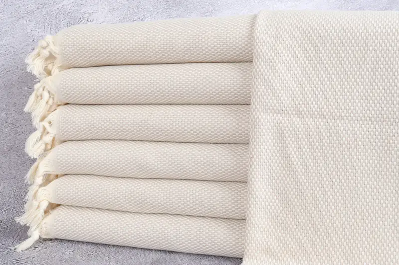 Premium Turkish Cotton ensures high absorbency and durability. Characterized by hand-weaving techniques, these towels maintain their flat-woven structure, allowing for dual-sided use and contributing to their multi-functionality. Weighing 120 grams, dimensions are 18x40 inches or 45x100 centimeters with a tolerance of up to 2 inches or 5 centimeters.