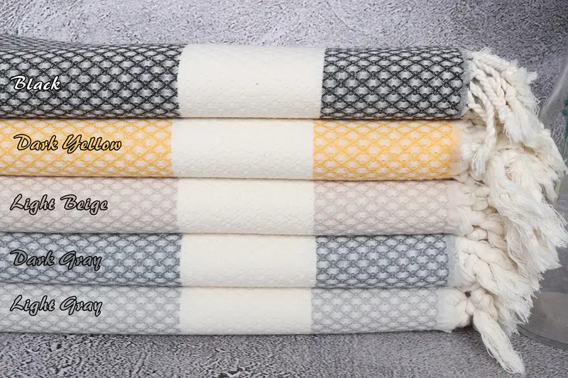 Organic Turkish cotton is utilized for the creation of these towels, ensuring sustainability and softness. Characterized by a 36"x67" dimension, these towels weigh 320 grams and exhibit a weaving tolerance of approximately 2" or 5cm. Hand-weaving results in a multi-purpose product, which may be utilized as kitchen towels, bath towels, or beach towels.