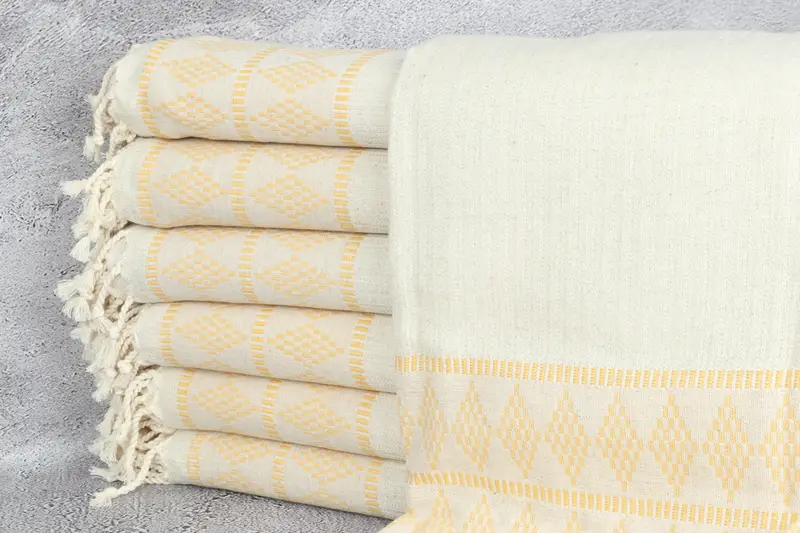 Premium organic Turkish cotton fibers characterize this towel, ensuring exceptional absorbency and a soft texture. Resulting from meticulous hand weaving, it features a size of 70x36 inches or 90x180 centimeters, with a tolerance of up to 2 inches or 5 centimeters. Weighing 480 grams, this towel is ready for diverse applications, from kitchen to beach use.