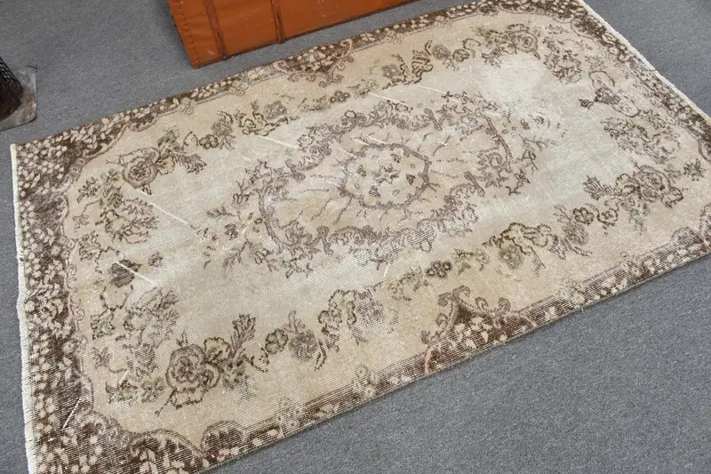 This vintage Turkish rug offers a captivating blend of size, colors, and pattern. Spanning 3.7x6.4 feet, the rug is a harmonious mix of brown and gray hues, enriched with elegant striped patterns. Each thread weaves a story of traditional craftsmanship.