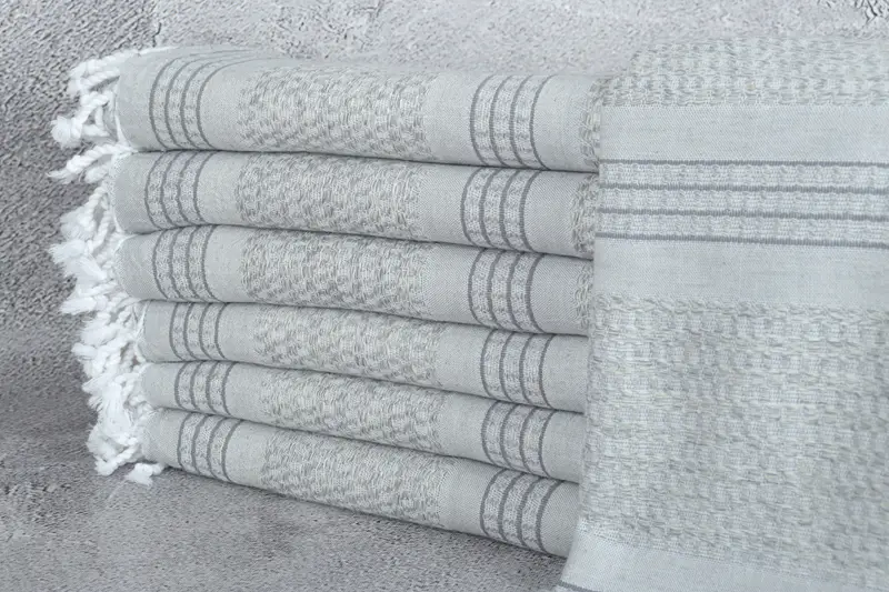 Characterized by their eco-friendly premium Turkish cotton composition, these towels ensure optimal absorbency and durability. Their lightweight yet robust nature results in a 36x71 inches dimension, translating to 90x180 centimeters, with a slight tolerance of 2 inches or 5 centimeters due to hand-weaving techniques. The beach towel, hand towel, or blanket weighs 340 grams, providing versatility for various uses.