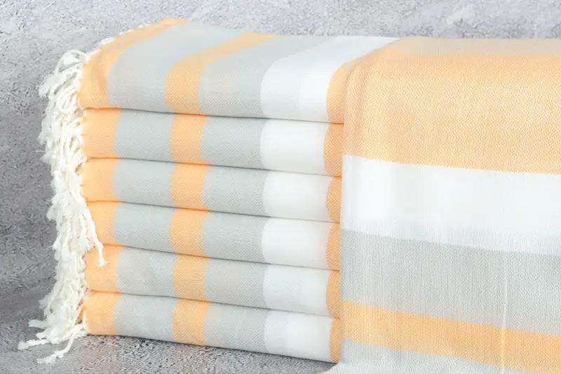 Characterized by organic Turkish cotton, these beach towels ensure high absorbency, making them ideal for multiple uses around the home. Measuring 40x71 inches or 100x180 centimeters with a tolerance of 2 inches or 5 cm due to hand-weaving, the towels weigh 300 grams each. They are designed for versatility and durability.