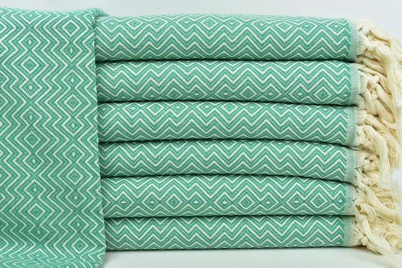 Turkish towels are crafted from premium Turkish cotton, ensuring superior absorbency and quick drying times compared to regular towels. These towels measure 38x71 inches or 95x180 cm, with a possible tolerance of 1-2.5 cm, and weigh around 300 grams per unit. Their hand-woven nature provides durability and texture characterized by the traditional hand looms.
