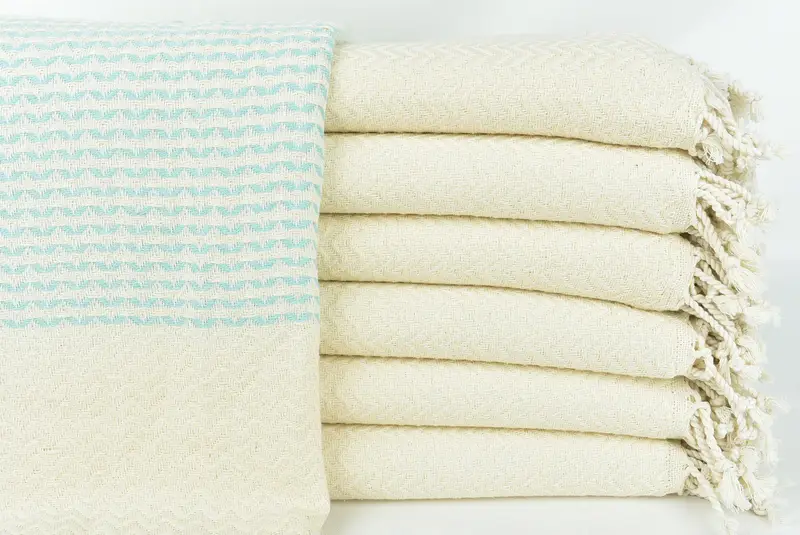 Turkish towels are composed of premium Turkish cotton, ensuring high absorbency and quick drying times. Resulting in lightweight towels, each piece weighs approximately 390 grams. Turkish towels are characterized by a hand-weaving process, allowing for tolerances of up to 1-2.5 cm in size.