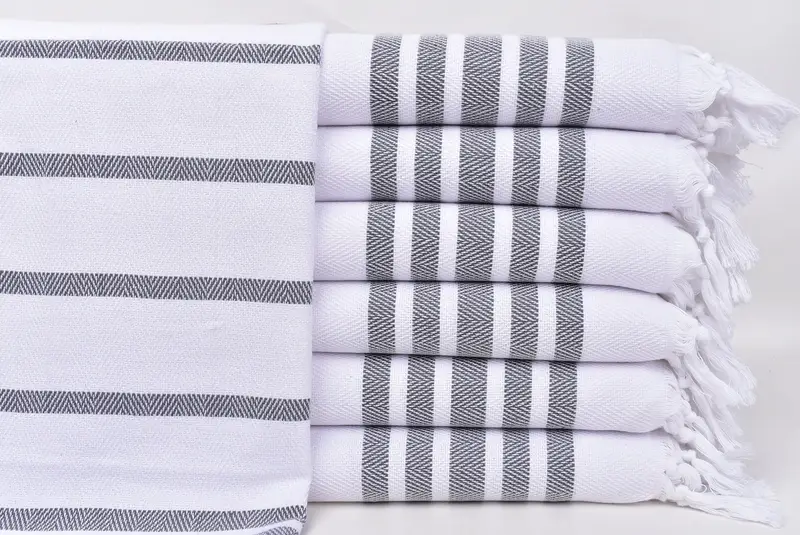 Turkish hand towels are distinguished by their material composition, featuring premium Turkish cotton known for its superior absorbency. These towels are traditional hand-loomed, resulting in a unique product characterized by its ability to dry quickly without the need for a dryer. The dimensional specification of these towels is 24x36 inches, which translates to 60x90 cm, with a tolerance of 1-2.5 cm. Each towel weighs approximately 120 grams, ensuring both lightweight portability and substantial durability.