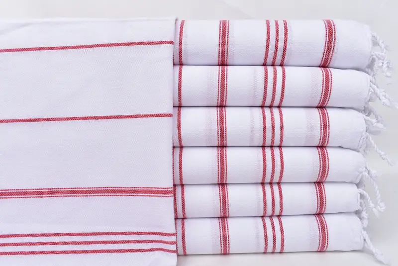 The dimensions of the Turkish hand towels are 24x36 inches (60x90 cm), accommodating slight variations. Each towel is meticulously woven by hand, ensuring precision and quality. The material's pre-shrunk status guarantees durability and resistance to shrinkage.