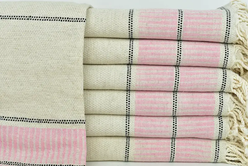 Turkish cotton is the primary fiber, renowned for its water absorbency and quick-drying properties. Characterized by hand-weaving on traditional looms, tolerances in size range up to 2.5 cm, ensuring each product maintains its unique charm and quality. Weighing approximately 340 grams, these towels provide optimal weight for various uses, with a standard size of 40x71 inches, or 100x180 cm.