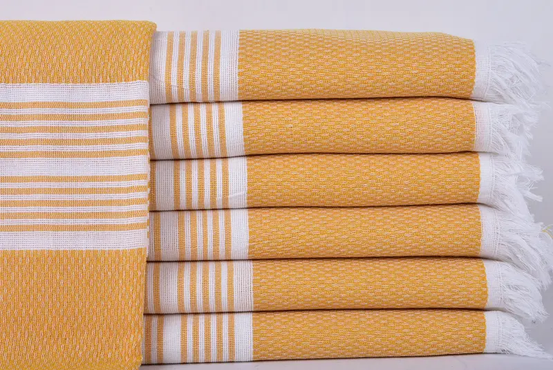 Turkish towels are made from premium Turkish cotton, ensuring superior absorbency and rapid drying times. Characterized by their dimensions of 40x69 inches (100x175 cm) with tolerances of ±1-2.5 cm, these towels weigh approximately 258 grams. These products are hand-woven on traditional Turkish hand looms, contributing to their unique texture and design.