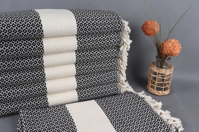 Organic Cotton Yarn ensures superior absorbency and comfort for all Turkish towels. Characterized by a size of 38x71 inches (95x180 centimeters), these towels weigh 415 grams, with a hand-weaving tolerance of up to 2 inches (5 cm). Each towel offers embroidery customization, pre-shrunk before delivery, and expedited shipping options including free shipping for orders over 35 USD. Return or exchange is accepted without hassle, with worldwide delivery in 3-5 days.
