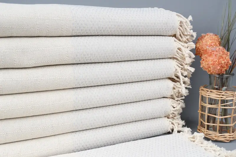 Absorbency ensured through organic cotton yarn, ensuring softness and durability. Characterized by a dimension of 40x71 inches (100x180 cm) with a tolerance of 2 inches (5 cm), and a weight of 480 grams. Handwoven properties allow for multi-purpose use including kitchen, bath, and travel.