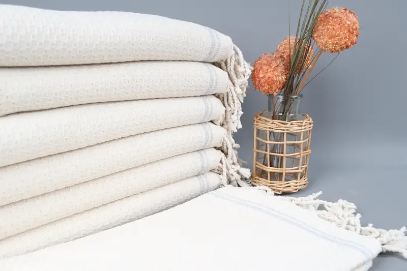 Organic cotton yarn characterizes the Turkish beach towel, ensuring superior absorbency and durability. The towel measures 36x67 inches (90x170 centimeters) with a tolerance of ±2.5 cm due to hand weaving, and weighs 440 grams. Customers can customize their towels with embroidery for personalization, and the product is pre-shrunk before shipping. Orders over $35 qualify for free shipping, and returns are accepted. The towels are handmade in a workshop in Turkey, with US-based orders fulfilled domestically.