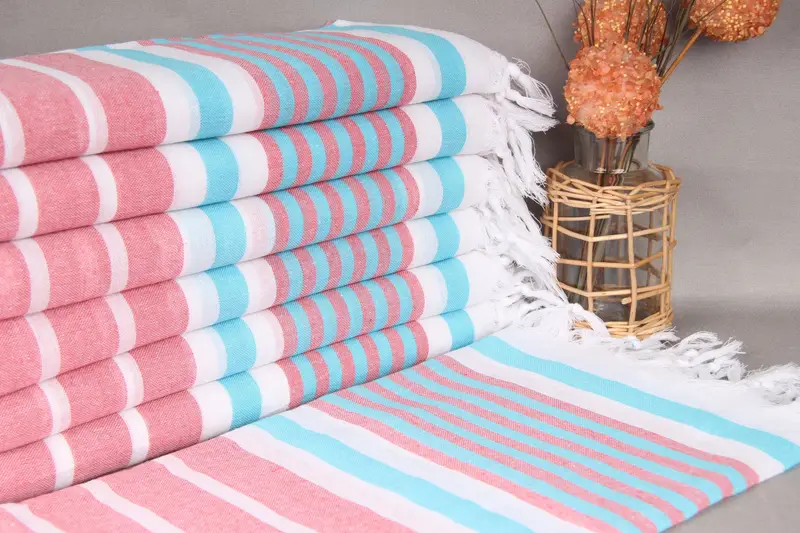 The bulk beach towel is made from organic cotton yarn, ensuring high quality and eco-friendliness. Characterized by a size of 40x67 inches (100x170 centimeters) with a tolerance of up to 2 inches (5 centimeters), it weighs 175 grams. Due to its hand-weaving process, the towel allows for minor variations in dimensions.