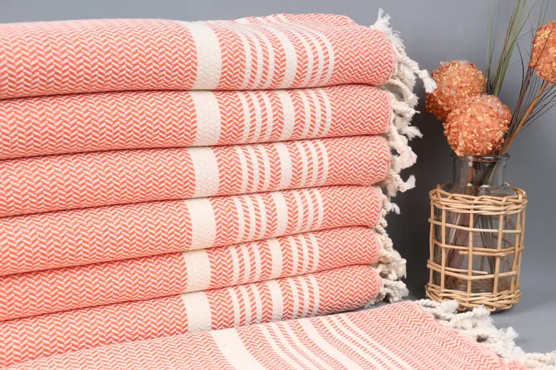 Turkish towels are characterized by their composition of organic cotton yarn, ensuring enhanced absorbency and durability. These towels are 18x40 inches, corresponding to 45x100 centimeters, with a slight tolerance of 2.5 centimeters due to hand-weaving processes. Weighing 112 grams, the towels are pre-shrunk and ready for immediate use.
