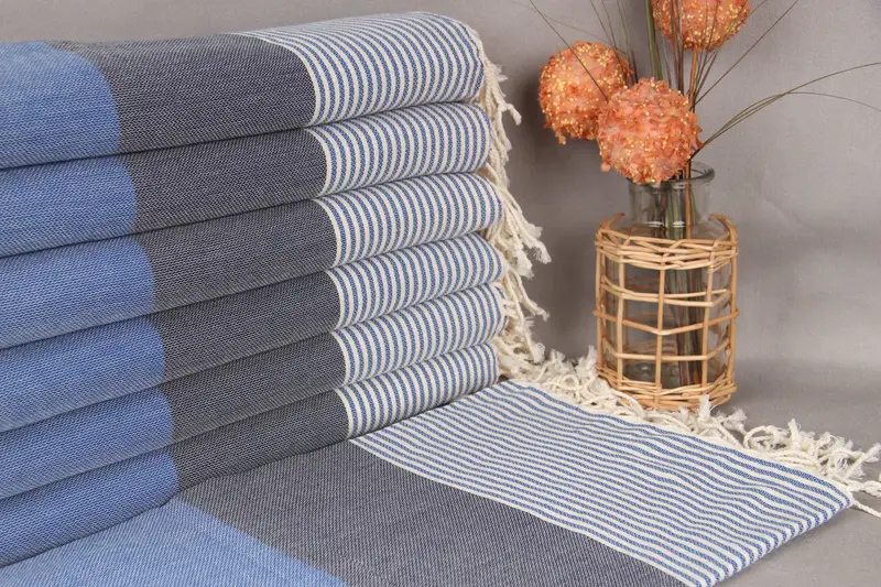 Turkish towels, characterized by their organic cotton yarn composition, ensure high absorbency and durability. Measuring 40x69 inches (100x174 cm) with a tolerance of up to 2 inches (5 cm), these handmade towels weigh 298 grams. Each piece undergoes meticulous hand-weaving, resulting in precise dimensions despite slight variations.
