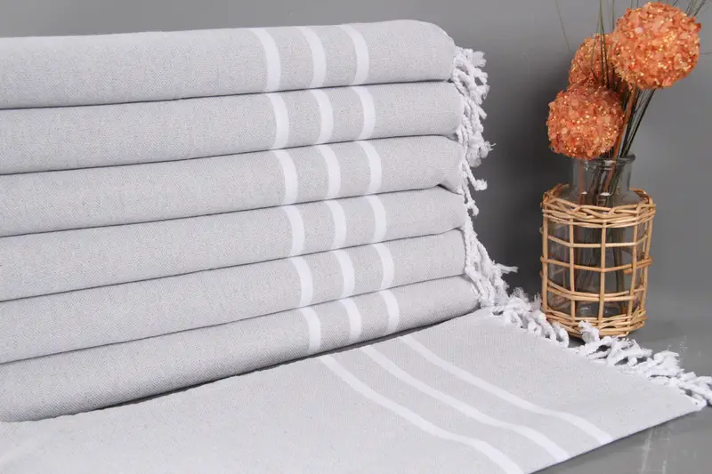 The Organic Cotton Yarn composition ensures optimal absorbency and durability for the towels. Characterized by a woven structure, these Turkish towels can be used on both sides, providing versatility for various household needs. Measuring 18x40 inches (45x100 centimeters) with a tolerance of ±2.5cm due to hand-weaving, the towels weigh 130 grams.