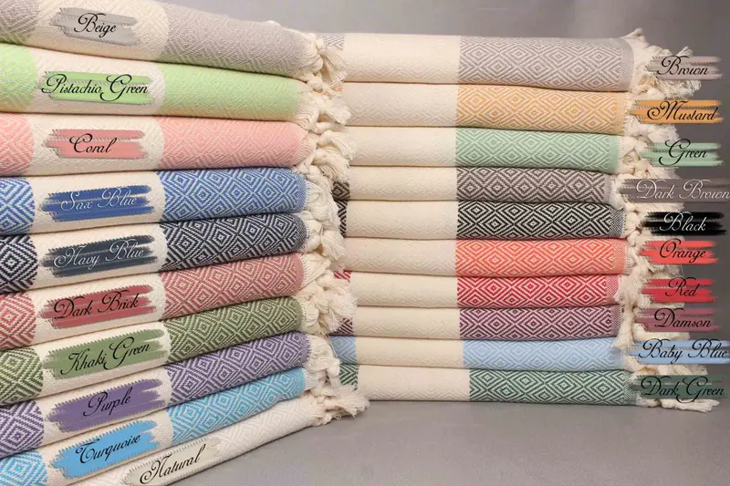 Turkish cotton towels are woven from organic cotton yarn, ensuring high absorbency and durability. Characterized by a size of 40x71 inches (100x180 centimeters) with a weight of 420 grams, the towels exhibit a hand-weaving tolerance of up to 5cm. Personalization options include embroidery of names or logos, available in various colors and fonts.