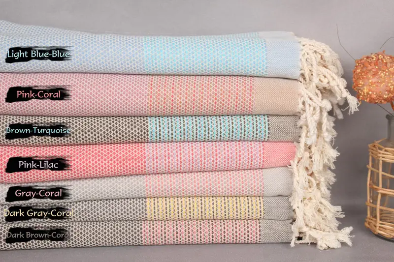 The Turkish towel is composed of organic cotton yarn, ensuring breathability and absorbency. Characterized by dimensions of 70x40 inches (180x100 cm) with a tolerance of 2 inches (5 cm) in weaving, the towel weighs 340 grams. The hand-weaving process allows for variations up to 2.5 cm.
