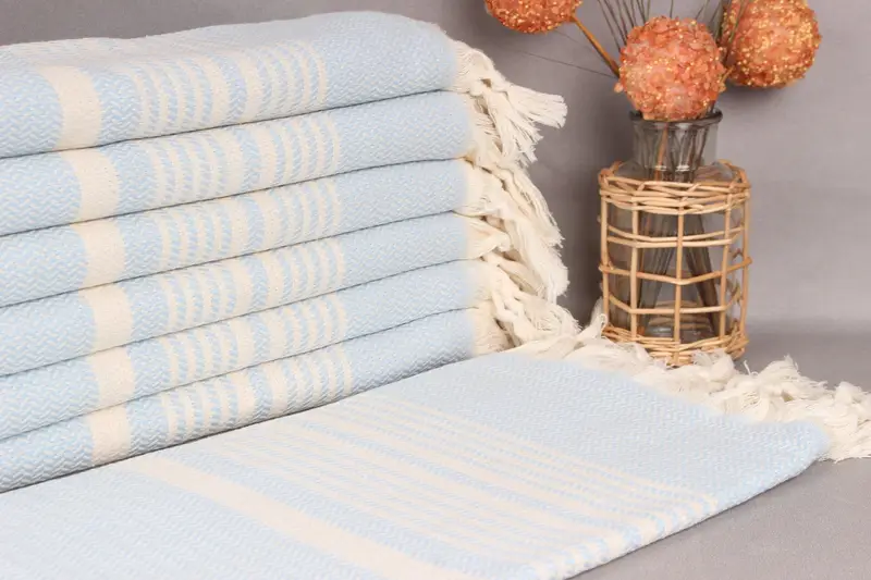 Hand-woven Turkish towels are characterized by their organic cotton yarn, ensuring superior absorbency and durability. Each towel, measuring 40x71 inches or 100x180 centimeters, weighs 420 grams with a weaving tolerance of up to 2 inches (5 centimeters). These towels can be personalized through embroidery, offering customization options for names or logos.