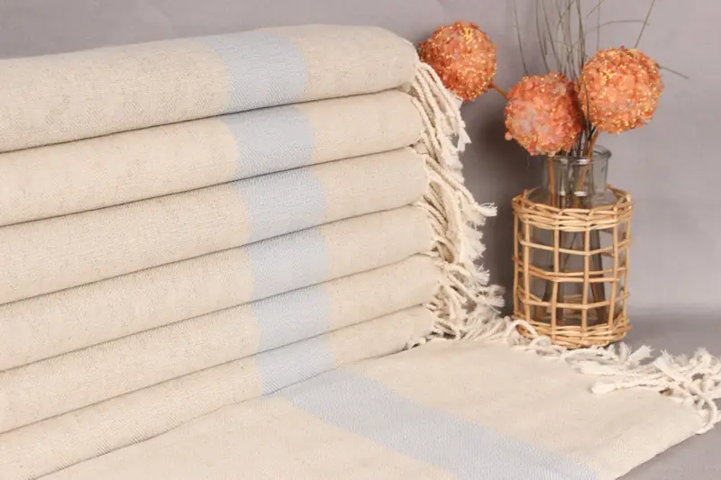 Organic cotton yarn characterizes these towels, ensuring high absorbency and softness. Dimensions are 36x71 inches (90x180 centimeters) with a tolerance of 2 inches (5cm) due to hand-weaving. Each towel weighs 280 grams, providing versatility in usage.