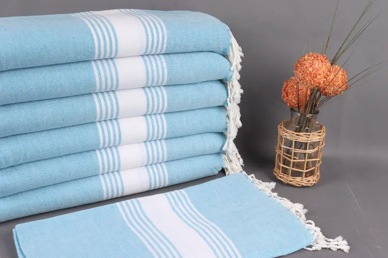 The Turkish towel comprises organic cotton yarn, ensuring high absorbency and softness, resulting in a versatile textile product. Measuring 38x75 inches (95x190 centimeters), the towel weighs 260 grams, with hand-weaving tolerances up to 2 inches (5 centimeters). Customization options include embroidery, with a pre-shrunk status and worldwide shipping in 3-5 days. Returns and exchanges are accepted, and orders over 35 USD qualify for free shipping. The towels are gentle-washable, with a recommendation to avoid bleach and fabric softener.