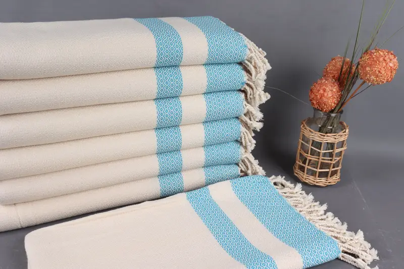 Organic cotton yarn characterizes the Turkish Beach Towel, ensuring both durability and breathability. Resulting in a weight of 370 grams, the towel measures 40x71 inches or 100x180 centimeters, with weaving tolerances of up to 2 inches (5 centimeters).