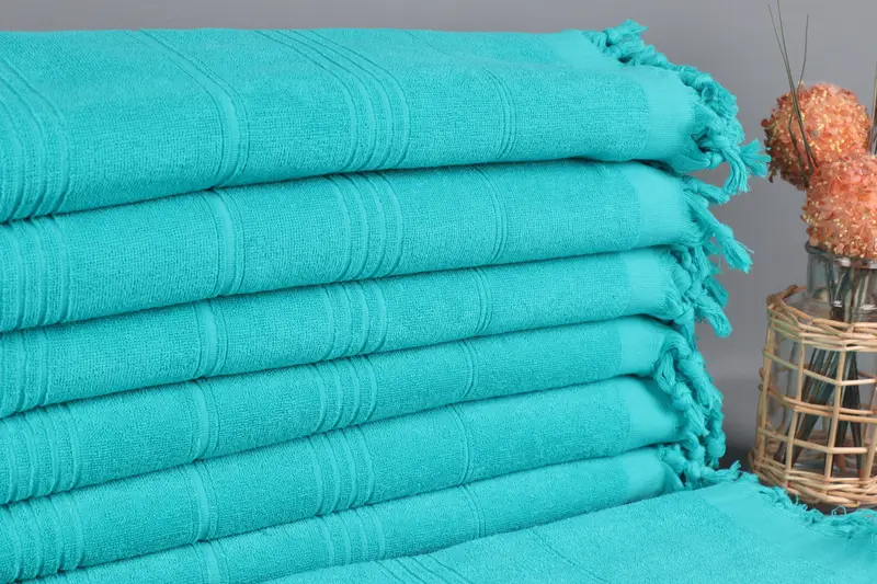 Turkish towels are characterized by their multi-purpose use, crafted from 100% organic cotton yarn. Ensuring exceptional absorbency and durability, they are meticulously woven to achieve dimensions of 36x71 inches, equivalent to 90x180 centimeters. These towels weigh 400 grams, with a tolerance of 2 inches (5cm) in size due to the hand-weaving process.
