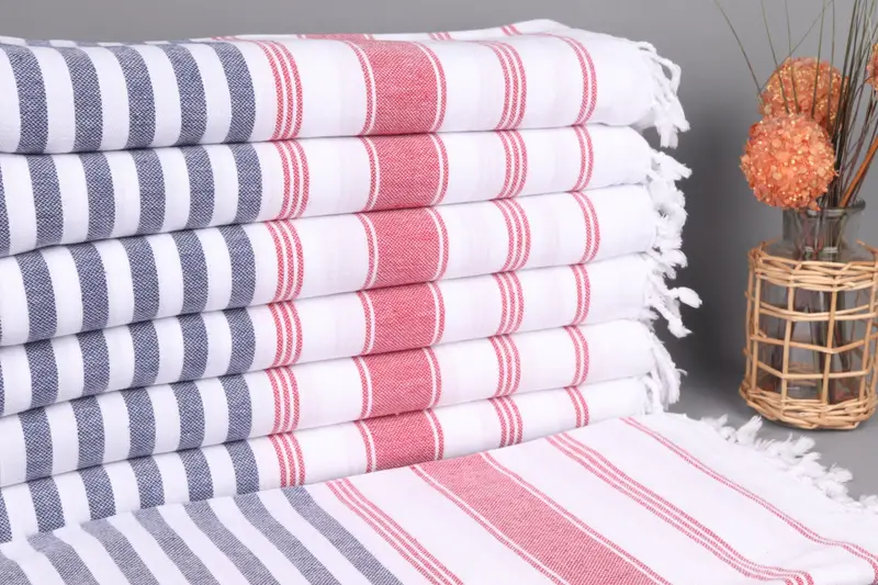 Turkish beach towels are characterized by their superior absorbency and durability, derived from organic cotton yarn. They exhibit a weight of 300 grams and dimensions of 40x71 inches, equivalent to 100x180 centimeters, with a weaving tolerance of up to 2 inches. Hand-weaving tolerances ensure the consistency and quality of the towels.