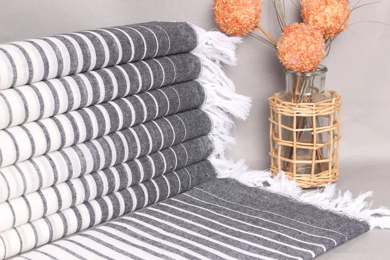 Turkish beach towels are characterized by their organic cotton yarn composition, ensuring a superior quality product. Resulting in a towel that is highly absorbent and soft, ideal for various household and personal uses. The towels measure 40x69 inches (100x175 centimeters) and weigh approximately 240 grams, with a hand-weaving tolerance of up to 5 centimeters.