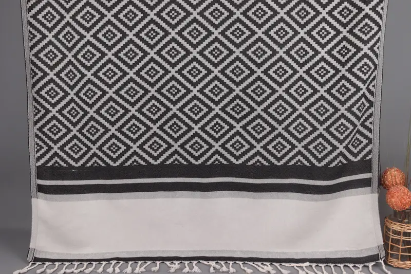 Fiber composition includes organic cotton yarn, ensuring high-quality absorbency. Characterized by dimensions of 69x36 inches (175x90 centimeters), the weight is 420 grams. Hand-weaving results in a tolerance of up to 2 inches (5 cm).