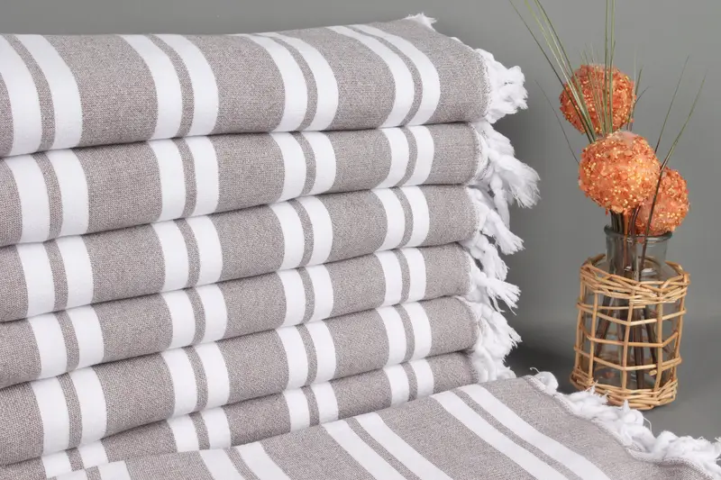 Turkish beach towels are characterized by their hand-woven construction and organic cotton yarn, ensuring durability and softness. Each towel measures 36x67 inches (90x170 centimeters) with a weight of 400 grams, and allows for a weaving tolerance of up to 2 inches (5 centimeters).