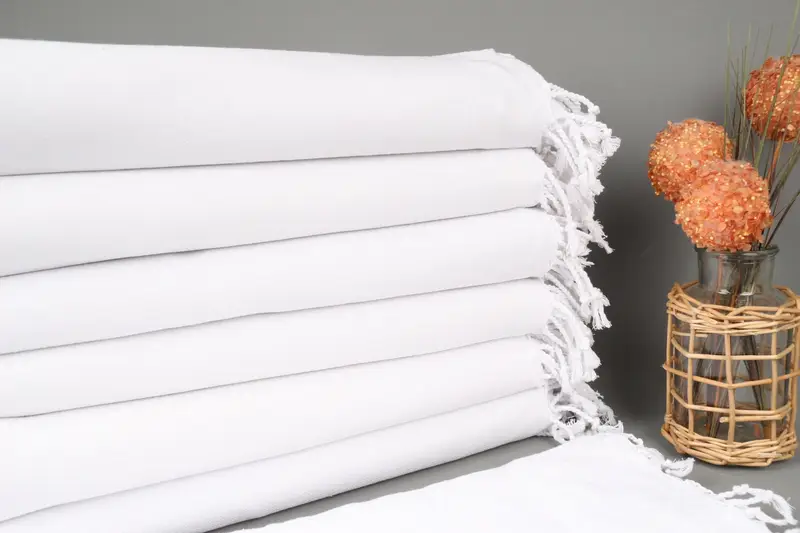 The material of the Turkish towels is organic cotton yarn, ensuring a natural and breathable fabric that absorbs moisture effectively. Characterized by a hand-weaving process, these towels measure 40x71 inches (100x180 cm) with a weight of 470 grams, allowing for a size tolerance of up to 2 inches (5 cm) due to the weaving technique. Embroidery customization is available, providing options for personalization. Pre-shrunk status is assured before initial use, with care instructions emphasizing machine or hand washing without bleach or fabric sof...