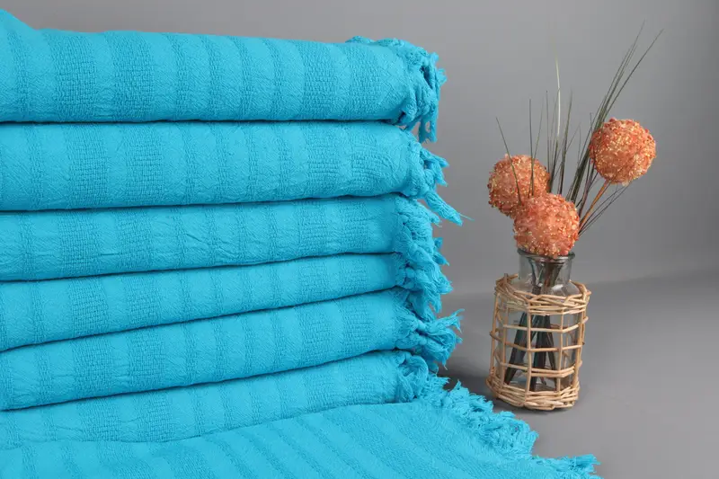 Turkish beach towels are renowned for their high quality, ensuring exceptional durability and versatility. The organic cotton yarn used guarantees superior absorbency, resulting in a lightweight and flat-woven textile that is ideal for various uses. Characterized by a tolerance of 1-2.5 cm in size due to the hand-weaving process, these towels are meticulously crafted to offer 90x170 cm dimensions and a weight of 300 grams.
