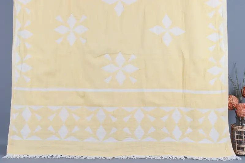 Organic cotton yarn characterizes this custom beach towel, ensuring superior absorbency and durability. The 36x67 inches dimensions, equating to 90x170 centimeters, offer versatile utility for various uses. Hand-weaving tolerances of 2 inches (5 cm) may apply, providing flexibility in size.