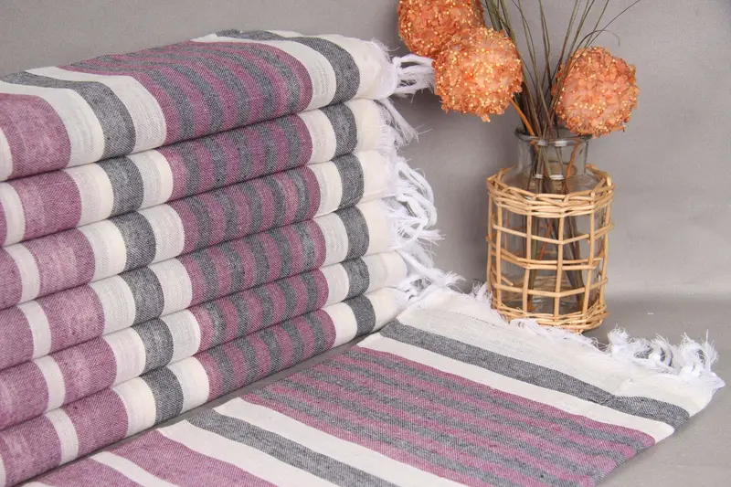 The Turkish Towels Beach product is woven from organic cotton yarn, ensuring high-quality and soft texture. Resulting in a versatile towel suitable for various purposes, the towel measures 40x67 inches, weighing 175 grams. Tolerances of up to 2 inches (5 cm) may apply due to hand-weaving.