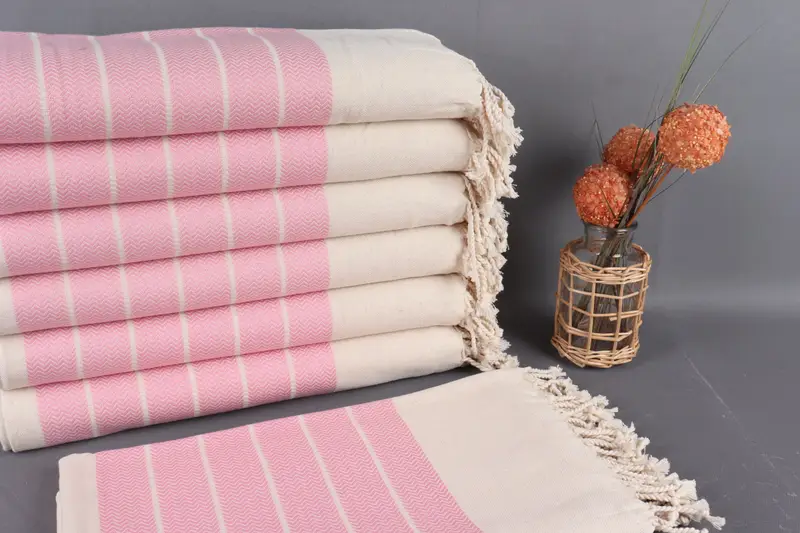 Organic cotton yarn ensures a premium, hypoallergenic fiber composition, characterized by high absorbency and durability. Measuring 40x67 inches (100x170 centimeters) with a tolerance of 2 inches (5cm), the Turkish towel weighs 330 grams. Hand-weaving results in minor size variations but maintains high-quality standards.