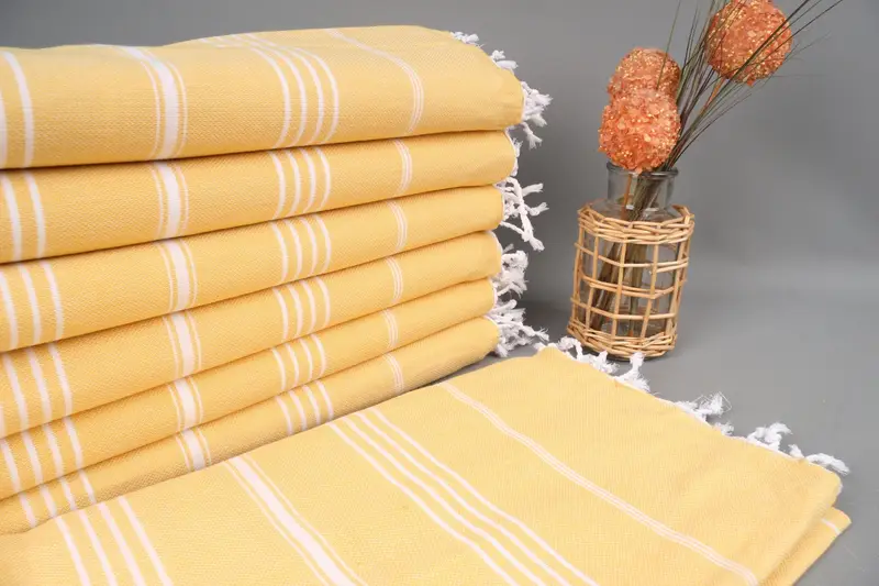 Comprising organic cotton yarn, this Turkish bath towel ensures superior absorbency and comfort. Resulting in a product that becomes softer with each wash, it is ideal for a multitude of uses, from kitchen to beach. Measuring 40x71 inches or 100x180 centimeters, the towel weighs 265 grams, with a weaving tolerance of up to 2 inches or 5 centimeters.