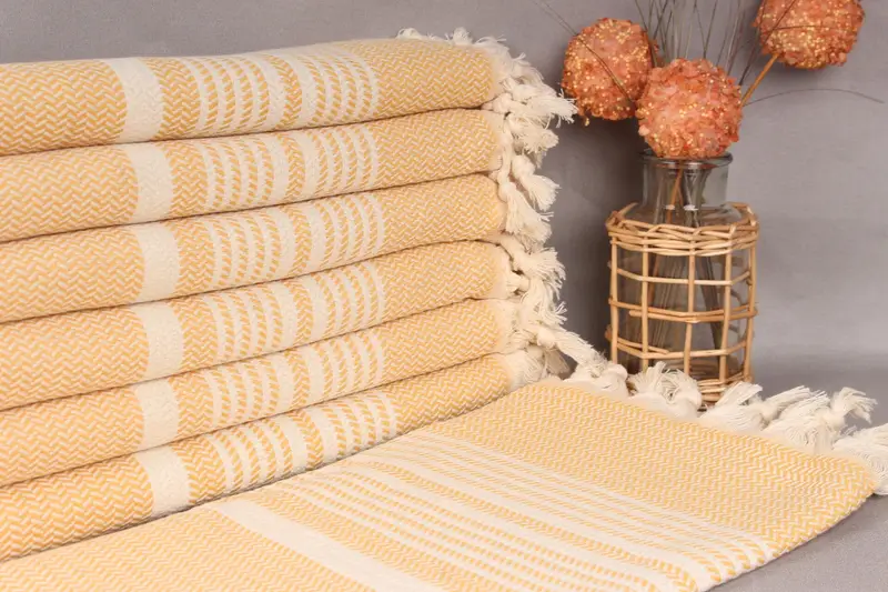 The Turkish towel is composed of organic cotton yarn, ensuring a premium fiber quality. Its dimensions are 40x71 inches (100x180 centimeters), with a weight of 420 grams. Hand-weaving may result in a size tolerance of up to 2 inches (5 centimeters).
