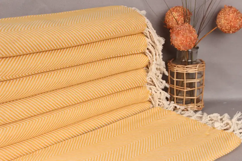 Organic cotton yarn ensures a premium feel and high absorbency in these handmade Turkish beach towels. Characterized by dimensions of 40x71 inches (100x180 centimeters), each towel weighs 400 grams. Weaving tolerances of up to 5 centimeters in size may occur.