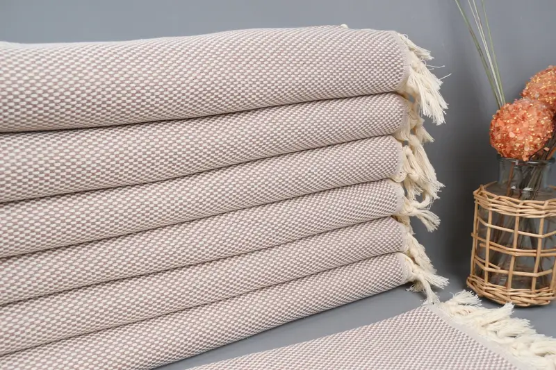 Turkish beach towels are woven with 100% organic cotton yarn, ensuring superior absorbency and softness. These towels are sized at 18x40 inches (45x100 centimeters) with a hand-weaving tolerance of up to 2 inches (5 centimeters). They are lightweight, weighing 120 grams, and can be used on both sides due to their unique weaving techniques.