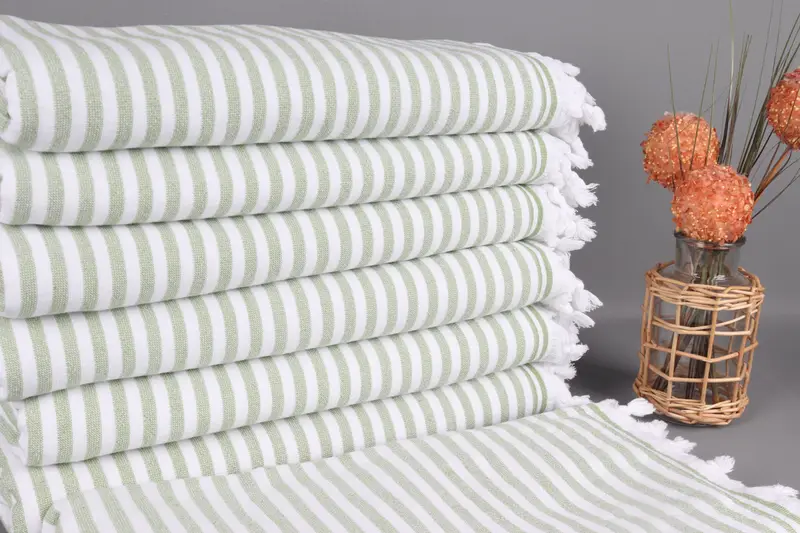 Multi-purpose Turkish Towels are versatile, suitable for kitchen, bath, baby, beach, travel, yoga, and more. They are also light and flat-woven, making them ideal for travel. The hand-weaving tolerance may result in slight size variations.