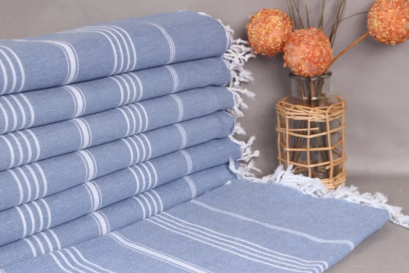 The 40x71 inches Denim Blue Cotton Towel is woven from organic Turkish cotton yarn, ensuring high absorbency and durability. Characterized by precise hand-weaving techniques, the towel measures 40x71 inches (100x180 centimeters) with a tolerance of up to 2 inches (5 cm) due to manual production. Weighing 265 grams, it is designed for multiple uses and can be personalized with embroidery.