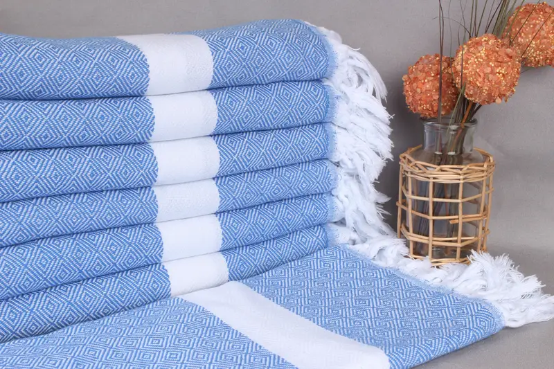 The Turkish towel is comprised of organic cotton yarn, ensuring a premium quality fiber composition. Characterized by its 40x71 inches dimensions (100x180 centimeters) with a weight of 360 grams, this towel is hand-woven with a tolerance of up to 2 inches (5 centimeters). Hand-weaving ensures the product may vary slightly in size.