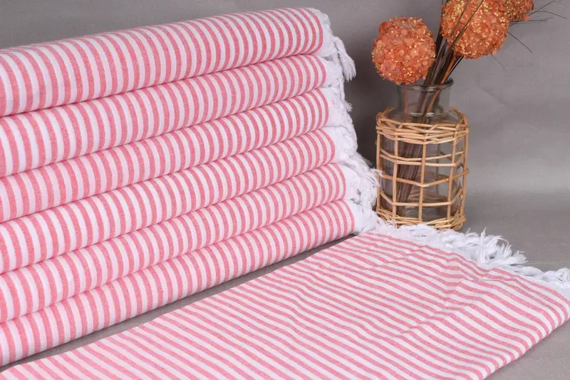 Turkish towels consist of high-quality organic cotton yarn, ensuring durability and exceptional absorbency. Characterized by their flat-woven design, these towels offer versatile utility. Specifications reveal dimensions of 36x67 inches (90x170 centimeters) with an acceptable tolerance of ±2.5 cm due to hand-weaving techniques. The weight of each towel is precisely 200 grams.