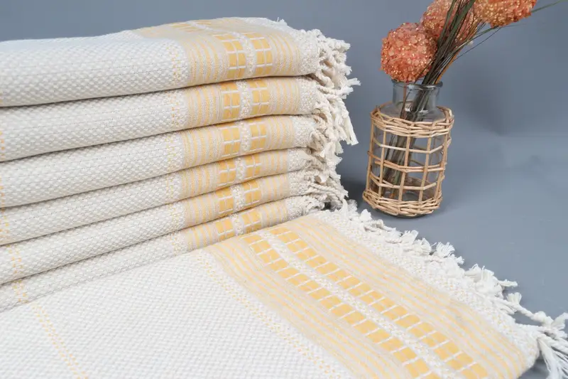 Handwoven Turkish towels, characterized by their use of organic cotton yarn, exhibit a high absorbency rate, ensuring efficient moisture management. Each piece is meticulously crafted in dimensions of 38x65 inches (95x165 cm), with a weight of 420 grams. Due to the hand-weaving process, there may be a size variation of up to 2 inches (5 cm).