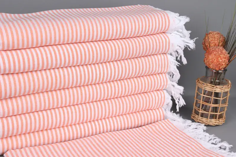 Turkish Beach Towels are crafted from high-quality organic cotton yarn, ensuring superior absorbency and durability. Characterized by dimensions of 40x63 inches (100x160 cm), these towels weigh approximately 200 grams, with a hand-weaving tolerance of up to 2 inches (5 cm). Each towel, due to hand-weaving techniques, is reversible and can be used on both sides.