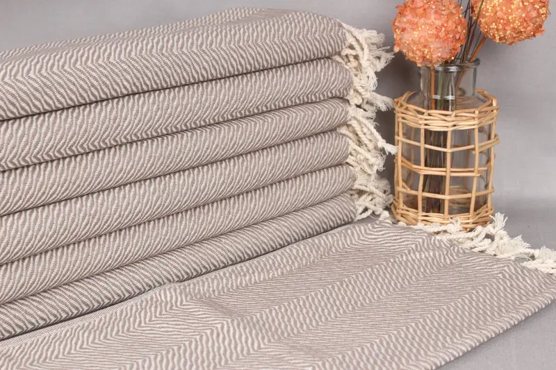 The Turkish hand towel, ensuring softness and absorbency, is woven from organic cotton yarns. Characterized by a 20x40 inches dimension and a weight of 100 grams, each piece can have a weaving tolerance of up to 2 inches. The towel's design allows for use on both sides and includes embroidery options to personalize the gift.